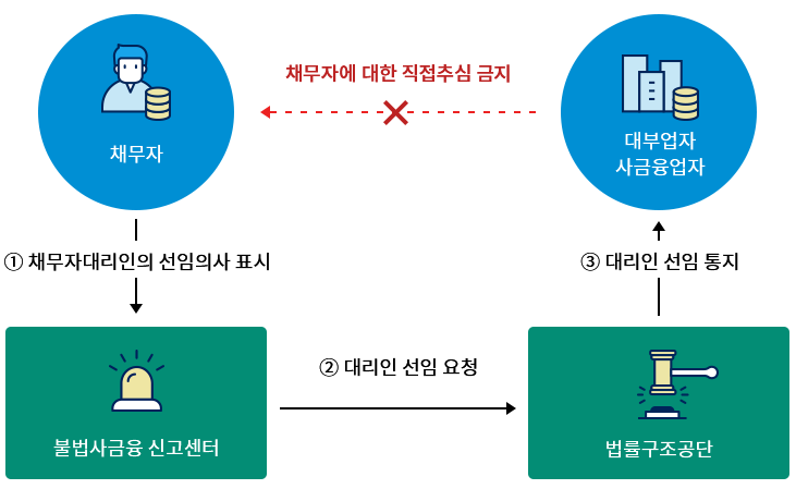 - 채무자대리는 대한법률구조공단의 소속 변호사가 채무자를 대신해 등록·미등록 대부업체 등으로부터 채권추심행위에 대응합니다.