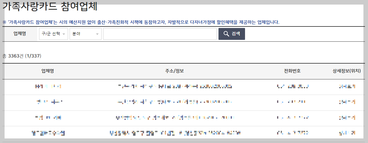 문화혜택에서 다자녀가정 지원 참여업체는 포스팅 작성 기준 총 3,363곳이 있으며 지속적으로 모집한다고 하니 더 증가될 것으로 예상합니다. 가족사업카드 참여업체는 '부산아이 다多가치키움+' 홈페이지에서 검색할 수 있으며, 거주지 근처 그리고 주말 나들이 계획 시 참고하시면 좋을 것 같습니다.